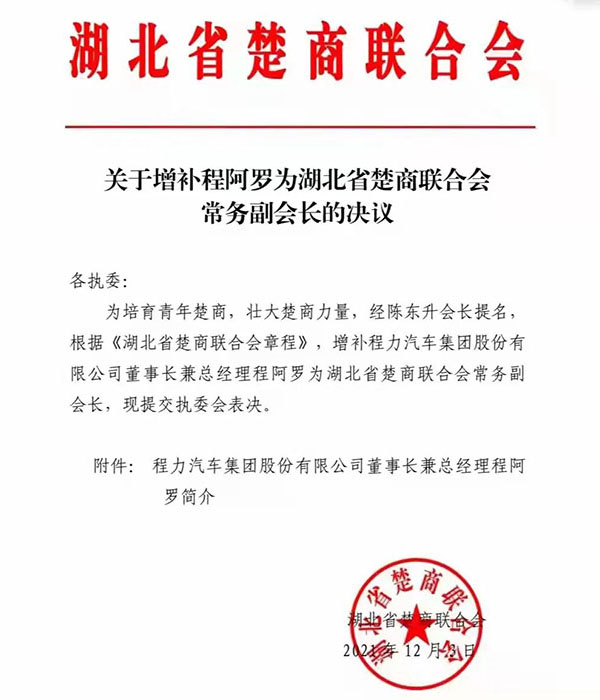 “虎威熠熠踏征程,八面來風共聚首”,程阿羅總經理作為省青企聯(lián)會長暨湖北省楚商聯(lián)合會常務副會長,由于其掌舵的程力汽車集團在中國專汽行業(yè)所作出的突出貢獻,特別是2021年在疫情反復肆掠,各種自然災害和國際國內市場震蕩低迷等不確定因素疊加效應影響下,程力集團萬眾一心攻堅克難,全年完成87億專汽產值,仍保持了2位數的百分比增幅,在全省“緩復蘇、補損失”的大環(huán)境下,保持了穩(wěn)健的發(fā)展勢頭,應邀出席了湖北省年度經濟工作會議,聆聽了湖北省委應勇書記和王忠林省長的發(fā)言和工作報告,積極為湖北經濟發(fā)展建言獻策。